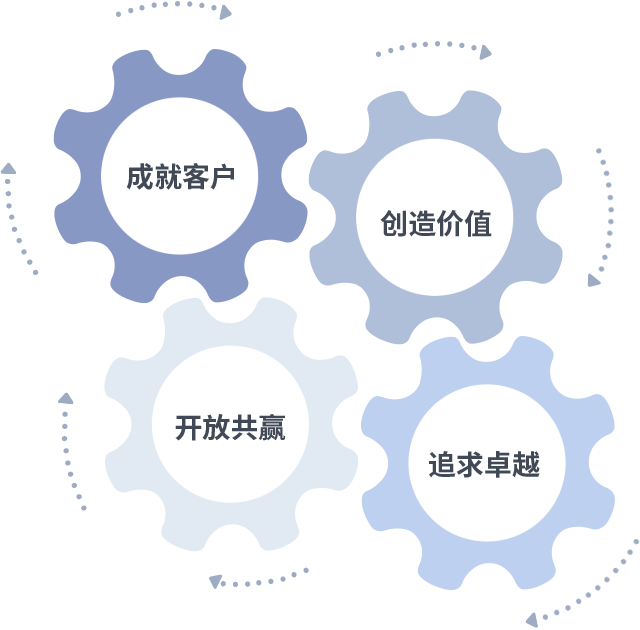 成就客户是一切决策的出发点,创造价值是衡量所有工作的标准,追求卓越是钱柜qg777做事做人的态度,开放共赢是钱柜qg777的格局也是最终的结果。价值观的齿轮环环相扣,推动着组织里的每个人不断向前。